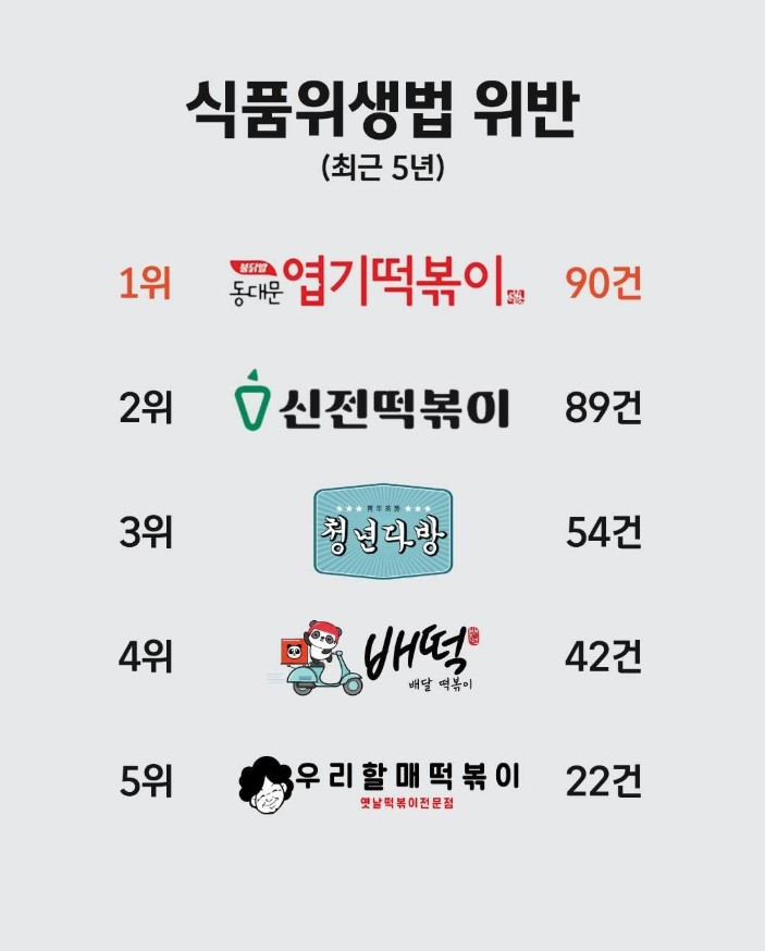 식품위생법 위반 브랜드 순위