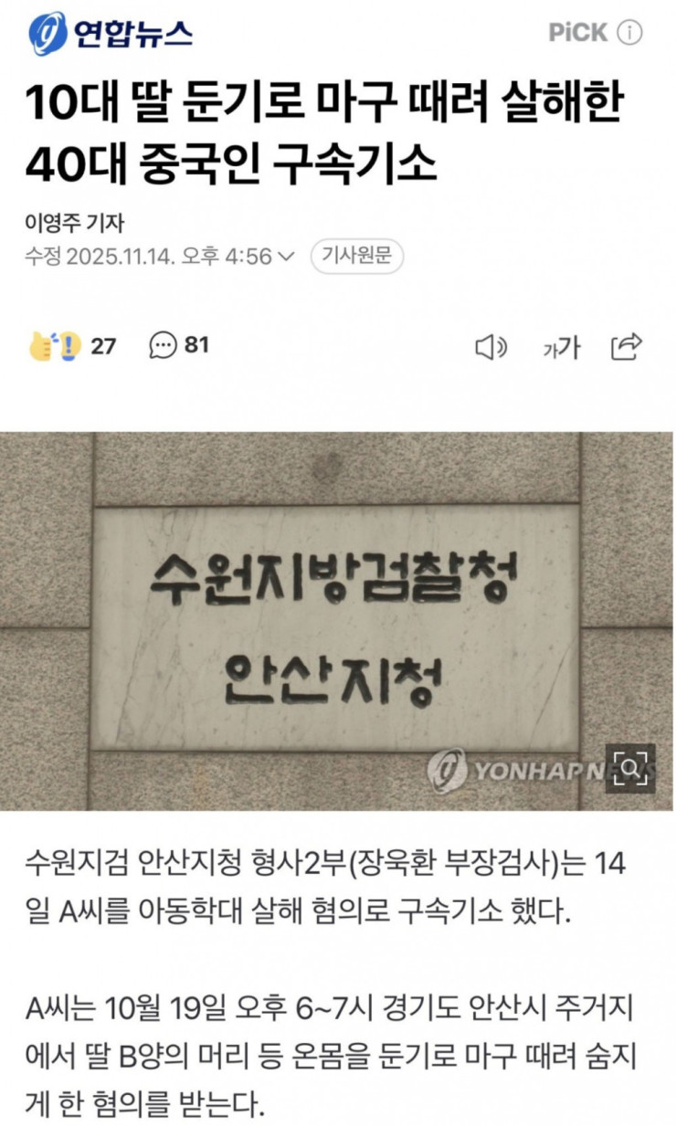 40대 중국인이 10대 딸 둔기로 마구 때려 살인