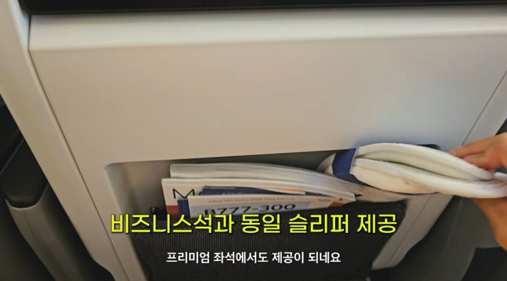 비지니스석과 같은 슬리퍼 제공 .콘센트는 좌석당 하나씩이고 기내식은 비지니스석처럼 코스로 나오는건 아니고 이코노미랑 다르게 나오긴함. 디저트는 비지니스처럼 하겐다즈 제공.