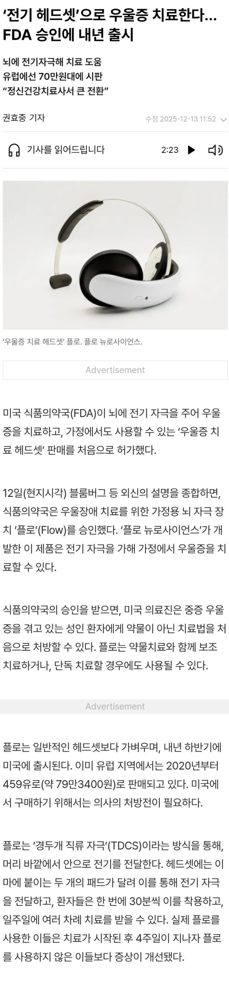 “전기 충격 헤드셋”으로 우울증 치료… 내년 출시.jpg