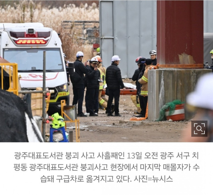 광주대표도서관 붕괴 사고로 매몰됐던 근로자 4명 중 실종됐던 마지막 1명이 숨진 채 발견됐습니다. 13일 광주소방안전본부에 따르면 이날 오전 11시 20분쯤 이번 사고 매몰자인 배관공 A 씨(50대)가 현장에서 발견됐습니다.