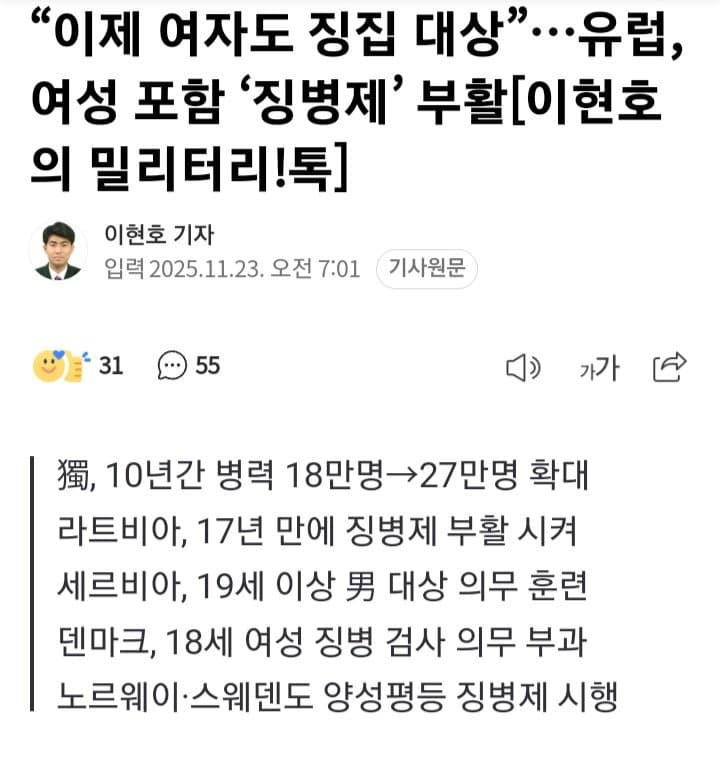 시대의 흐름에 맞게 여성도 징병 대상에 포함이네여