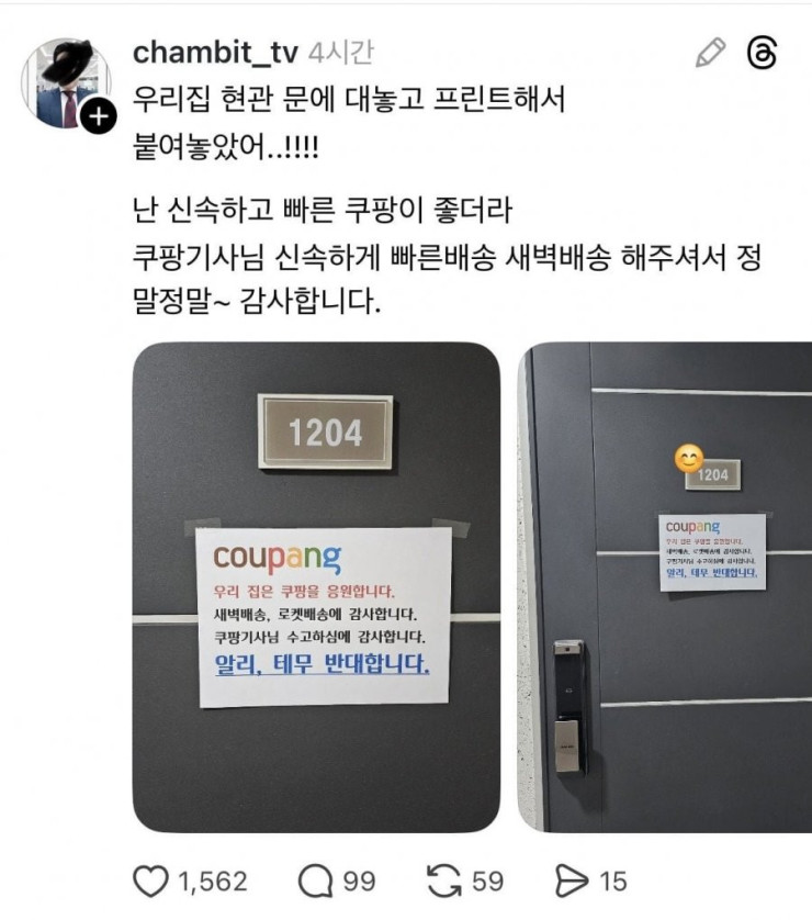 현시점 쿠팡을 지지한다고 현관문에 광고중인 쓰레드인