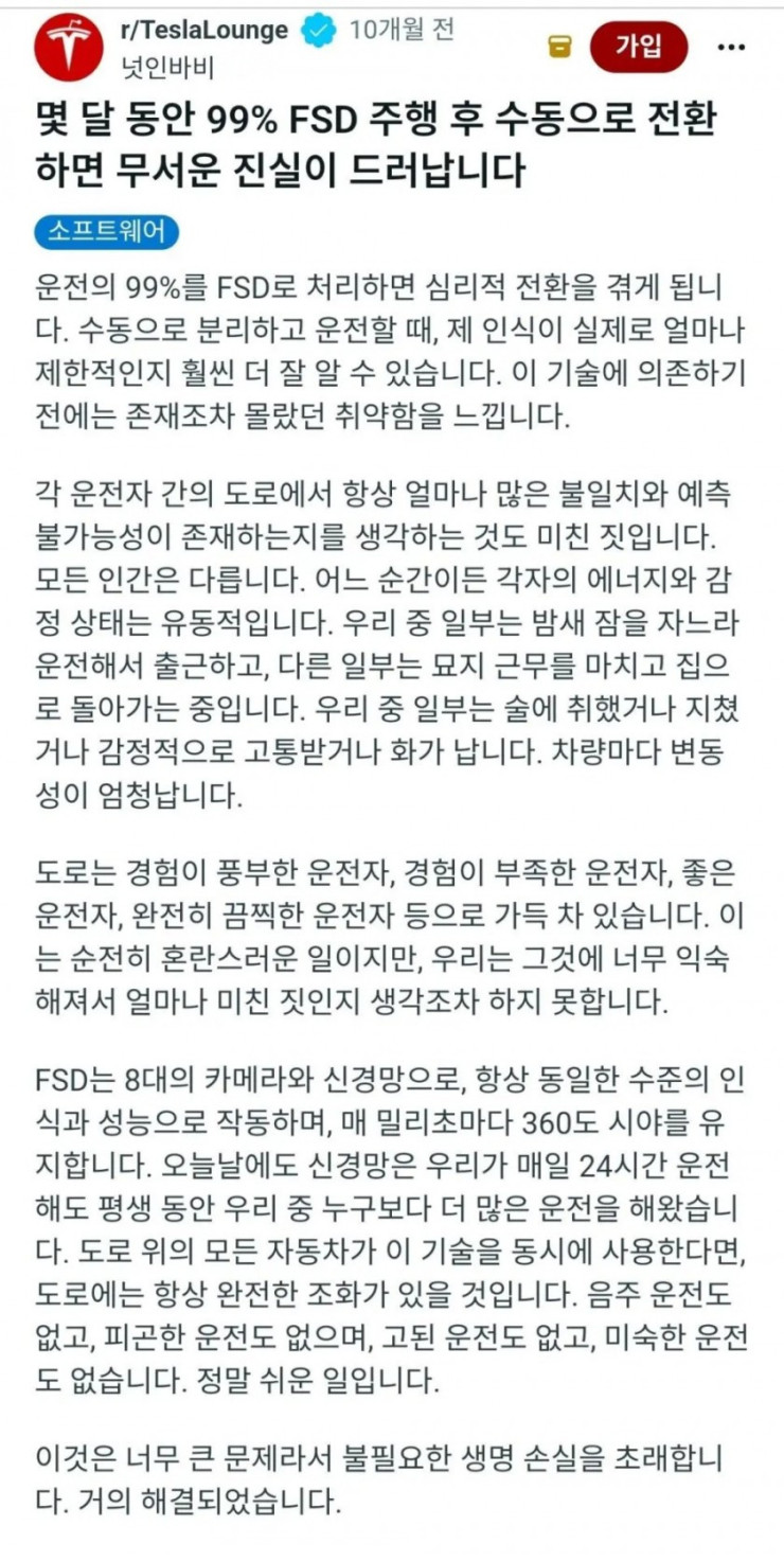 몇달간 99% FSD 운전 후 수동을 해보고 깨달았다는 차주