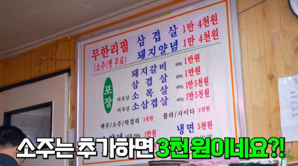 그냥 가면 1인당 1만4천원에 소주 한병 무료고 전단지 가져가면 소주 없이 1인당 1만원 .. 그리고 소주 맥주 막걸리 다 3천원..ㄷㄷ