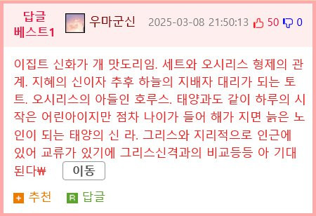 이집트 신화도 그리스로마 못지않게 난리통인 상황 많던데 개존잼일듯
