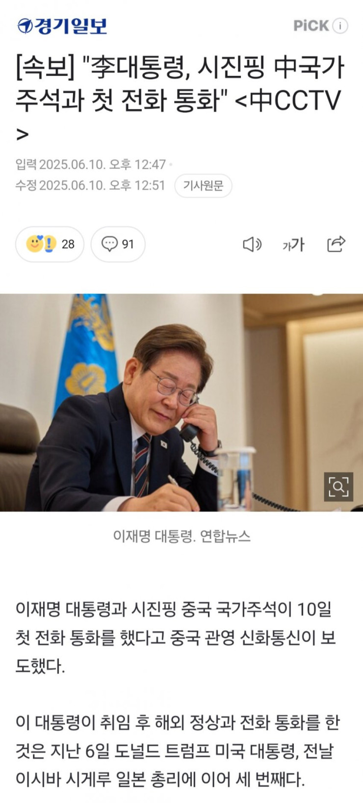 李 대통령, 시진핑 中 국가주석과 첫 통화