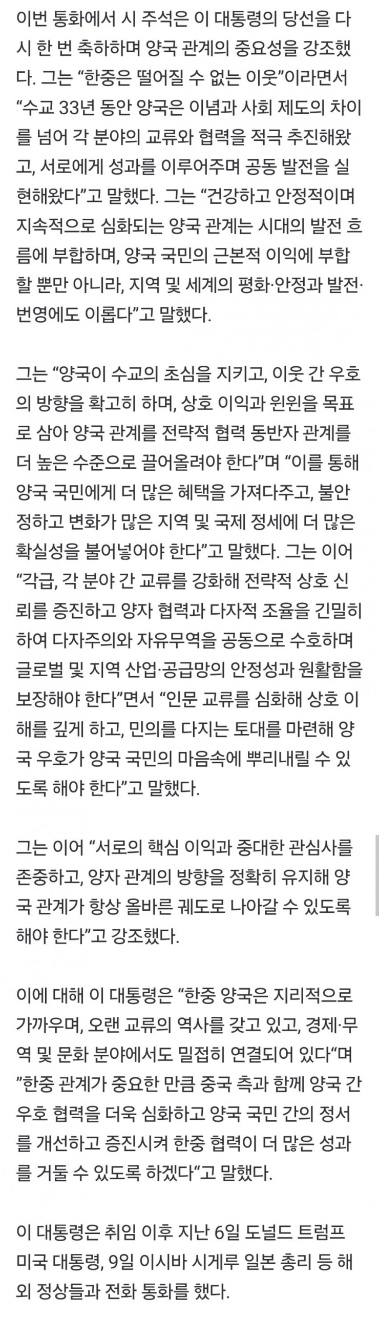 시진핑 국가주석과 전화 통화