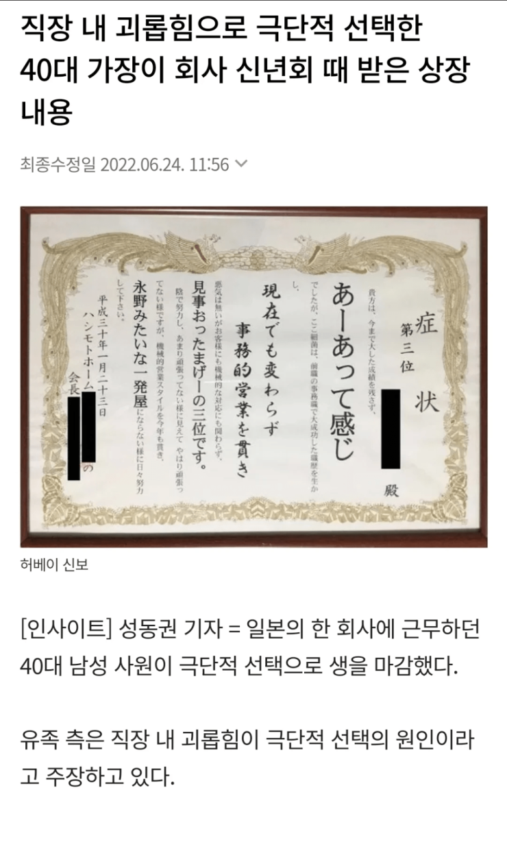 폐급상을 받아 자살한 옆일본 직장인