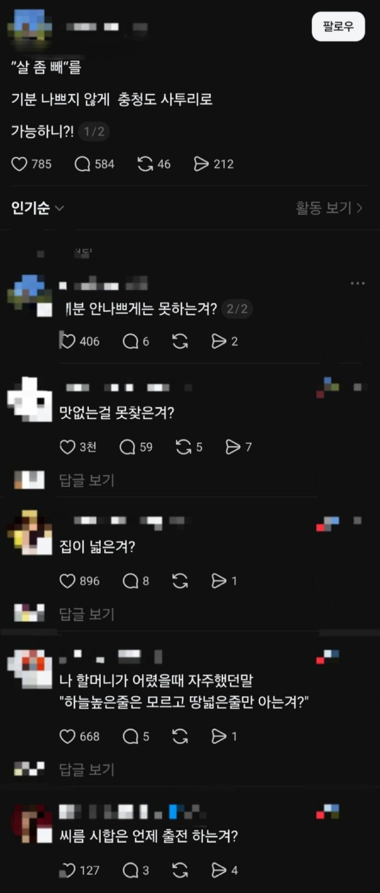 "살 좀 빼"를 기분나쁘지 않게 충청도 사투리로 하면?