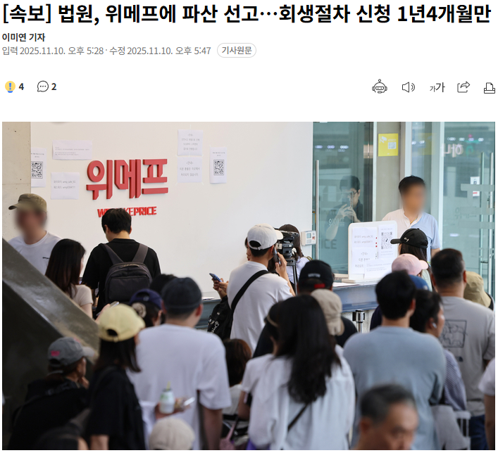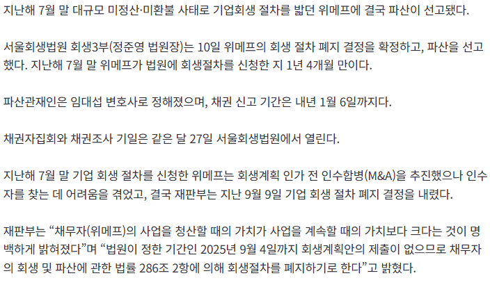 법원, 위메프에 파산 선고