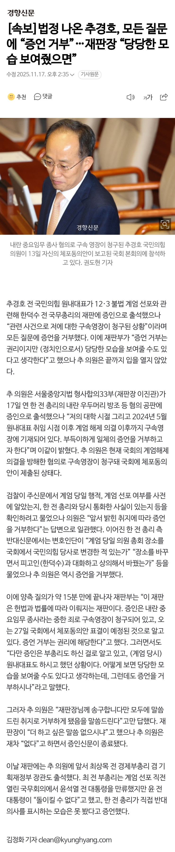 법정 나온 추경호, 모든 질문에 “증언 거부”