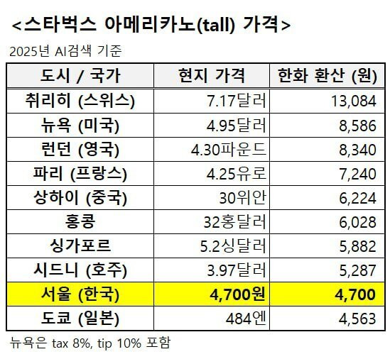 전세계 스타벅스 가격 비교
