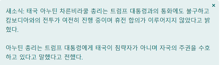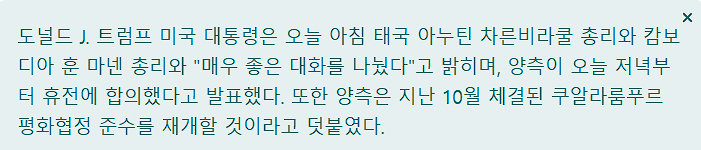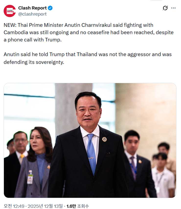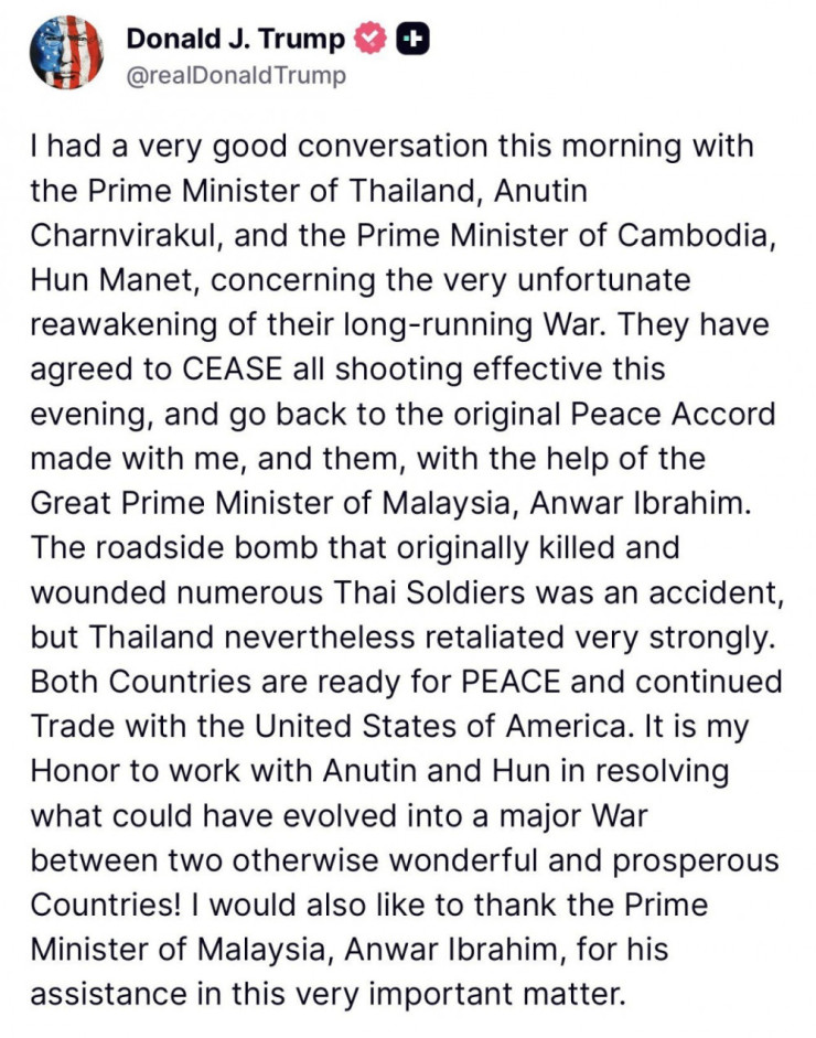 출처 - 트윗(X) 도람프 : 태국.캄보디아랑 통화했고 휴전하기로 합의 했음.