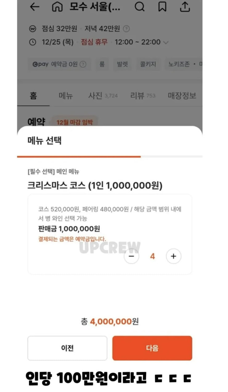 안성재 레스토랑 모수 크리스마스 시즌 가격ㄷㄷ