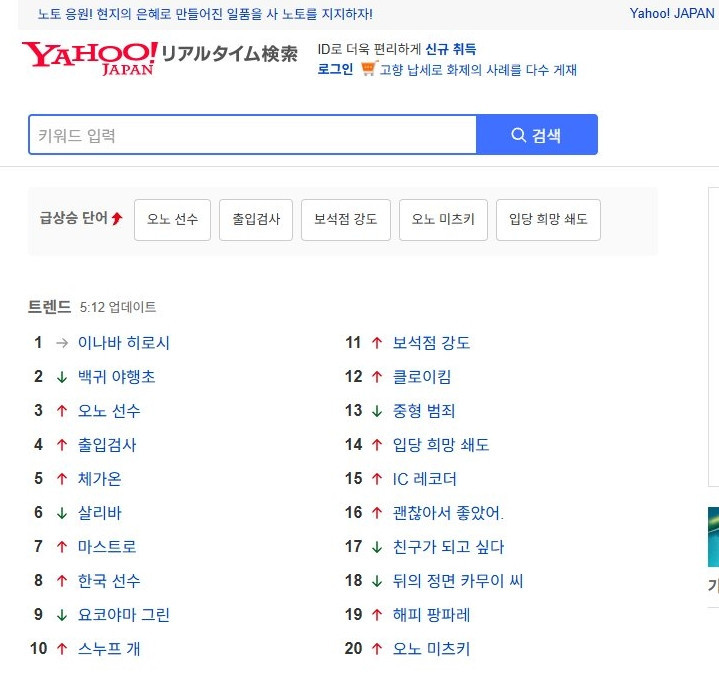 일본 야후재팬 실시간 검색어 최가온 5위