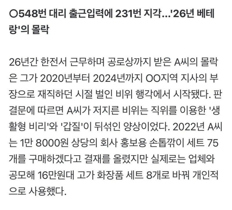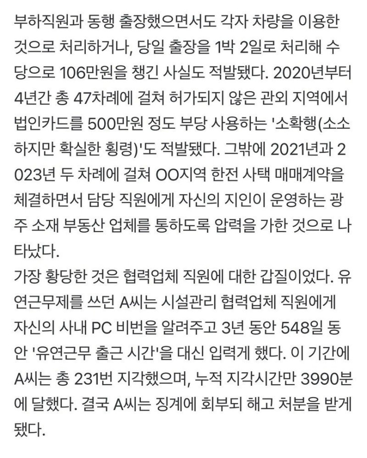 A씨는 재판에서 근무시간 대리입력에 대해 "어머님의 건강 사유로 광주에서 OO지역으로 매일 출퇴근하면서 지각이 잦자 안타깝게 여긴 협력업체 과장이 먼저 제안한 것"이라며 "유연근무제에서는 출근시간 10분 이내 입력하면 지각으로 보지 않는 게 관행"이라고 주장했다.