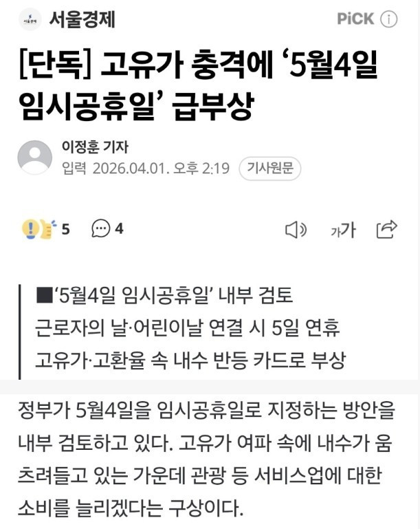 고유가 충격에 ‘5월4일 임시공휴일’ 급부상