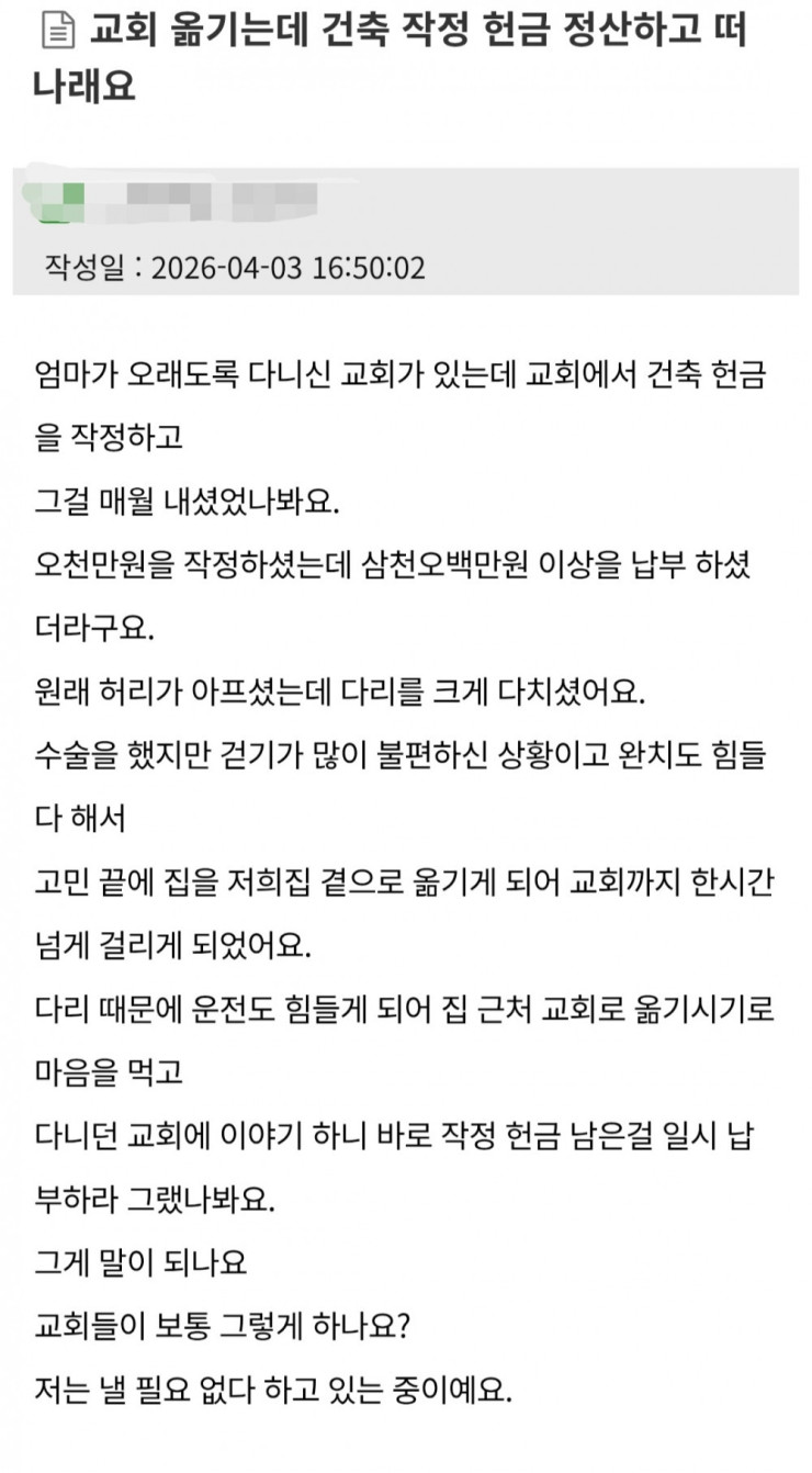 교회 옮기는데 건축 작정 헌금 정산하고 떠나래요