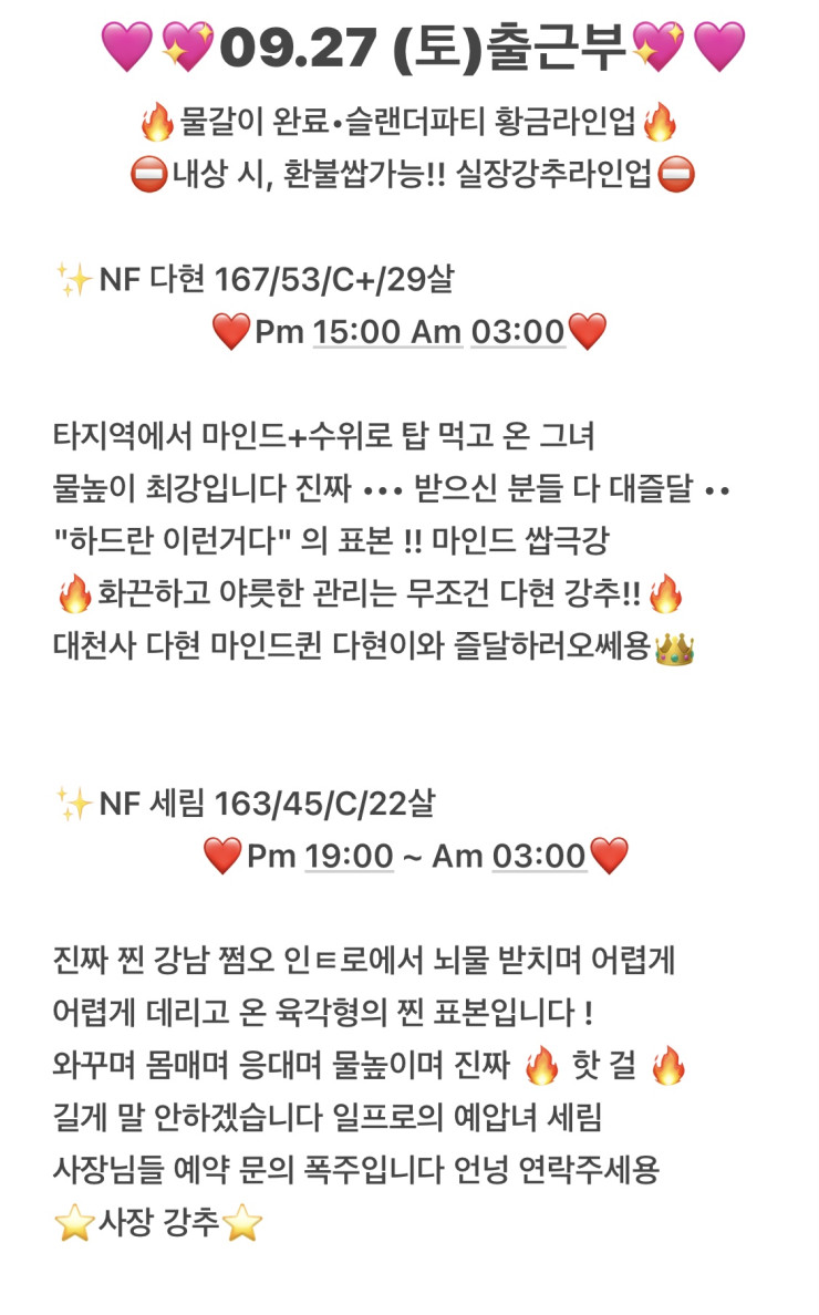 오늘 출근하시는 세림쌤은 찐 22살이신데 와꾸+몸매+응대 뭐하나 빠지는거 없습니다 ! ⭐️사장강추⭐️